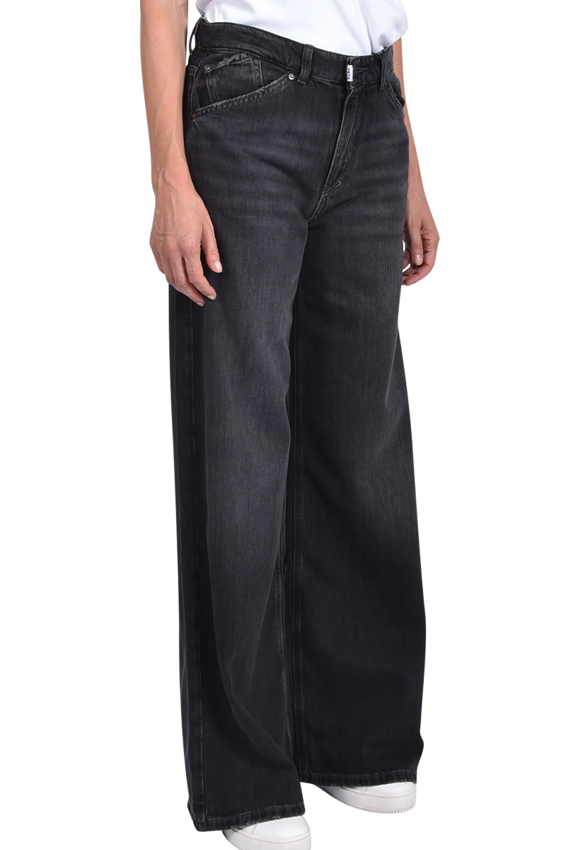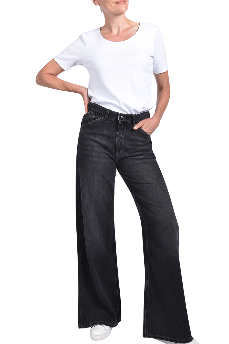 Die Denim 16_THE RAVER in mittlerer Waschung mit helleren Abriebstellen. Sie hat eine extremere Baggy Schnittform mit sehr weitem überlangem Bein.