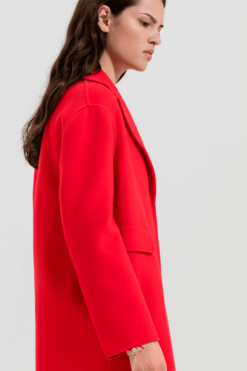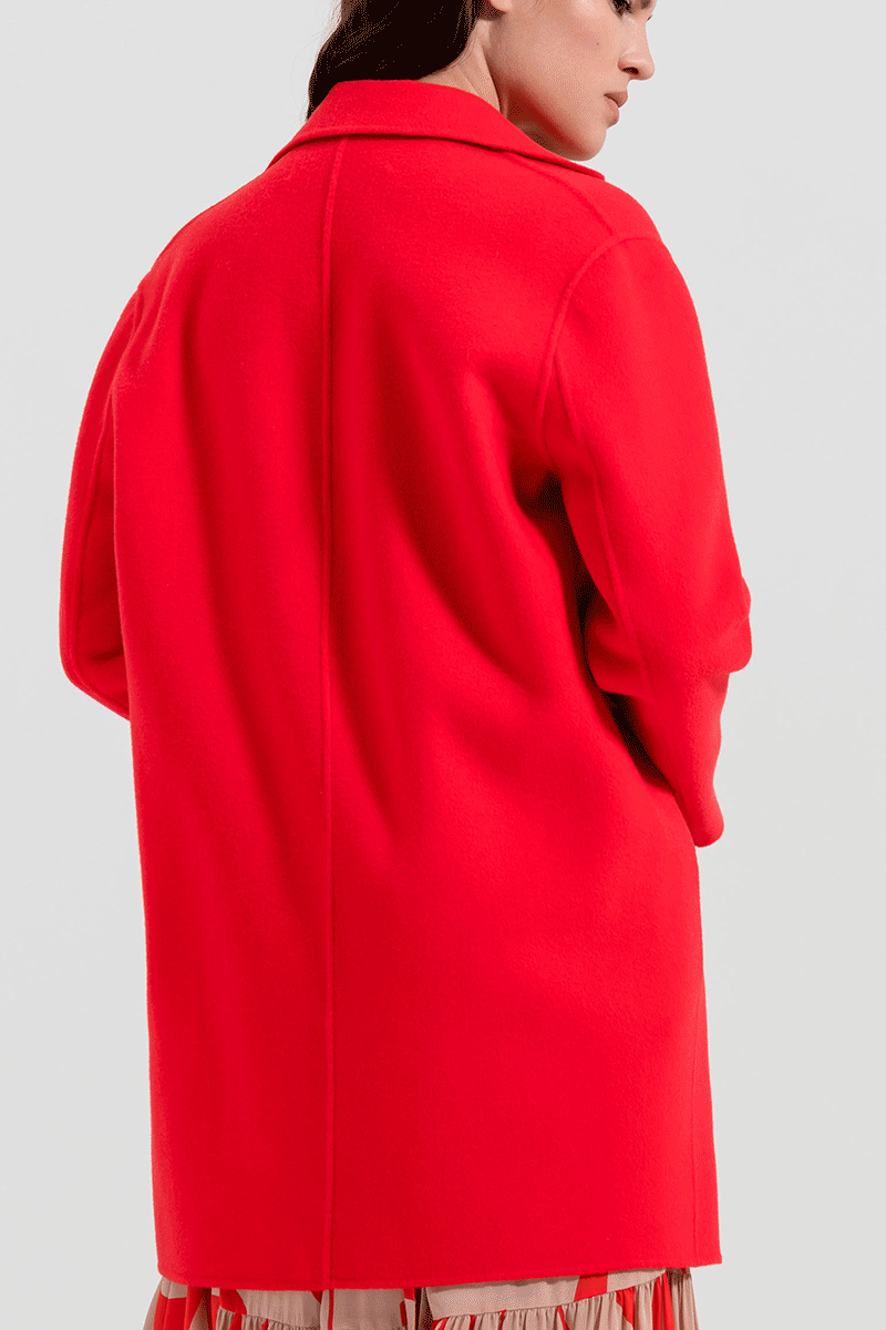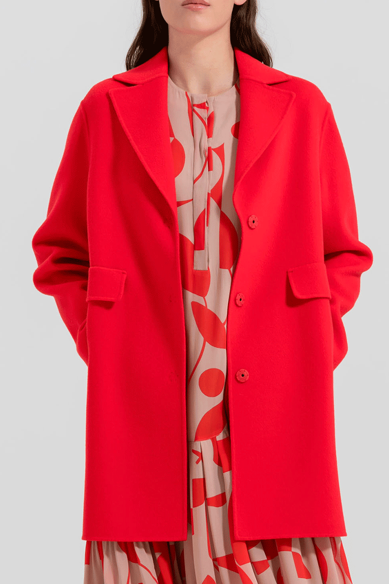 Kurzer Blazermantel aus luxuriösem Wolle-Kaschmir-Mix in handgefertigter Doubleface-Verarbeitung mit Reverskragen und verdeckten Druckknöpfen. Aufgesetzte Patten und zwei seitliche Eingrifftaschen zieren die Vorderseite.