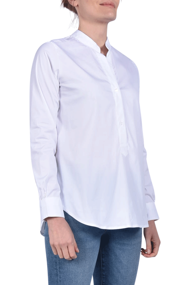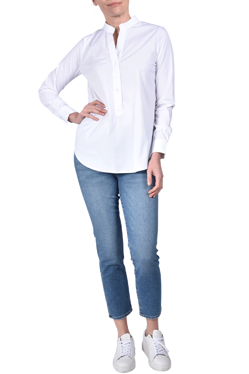 Die klassische Bluse zeigt sich in einem lässigen, weiten Schnitt. Der abgerundete Saum und der Stehkragen mit V-Ausschnitt geben der Bluse moderne Details.