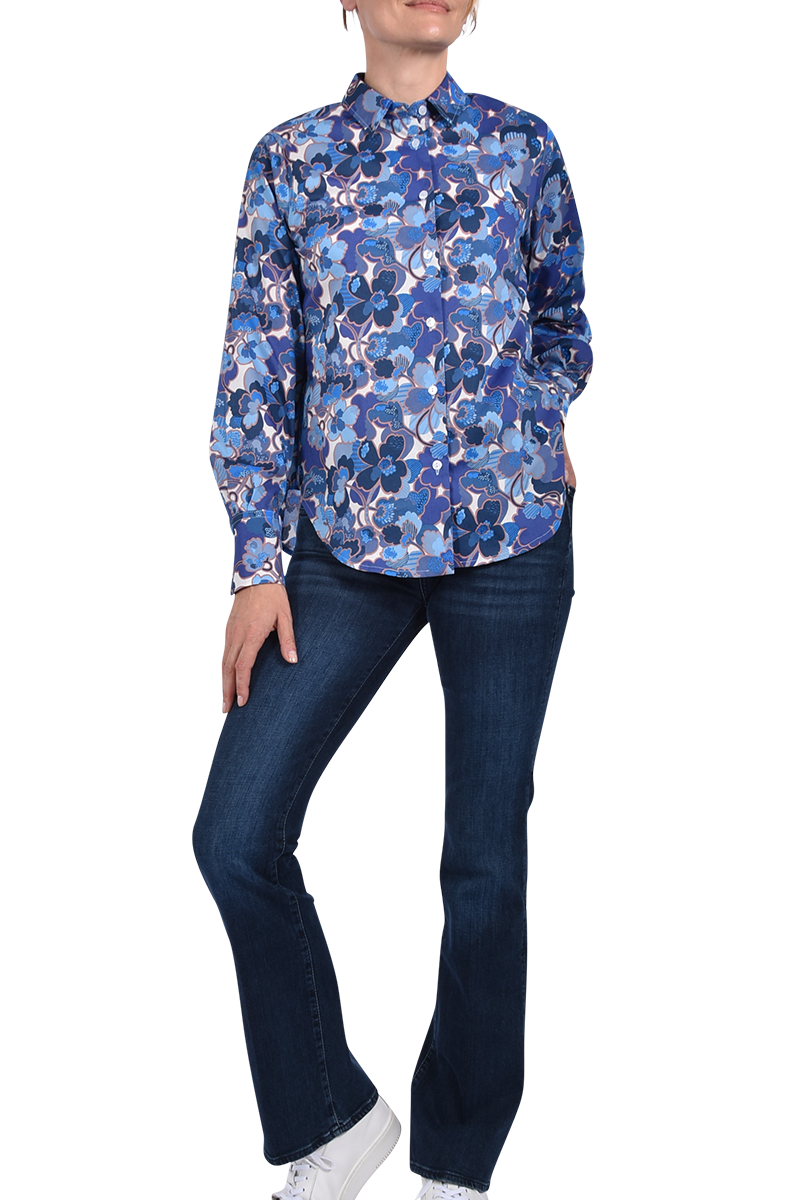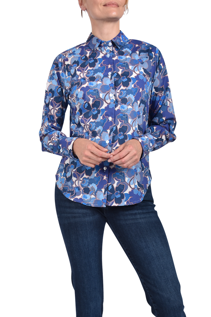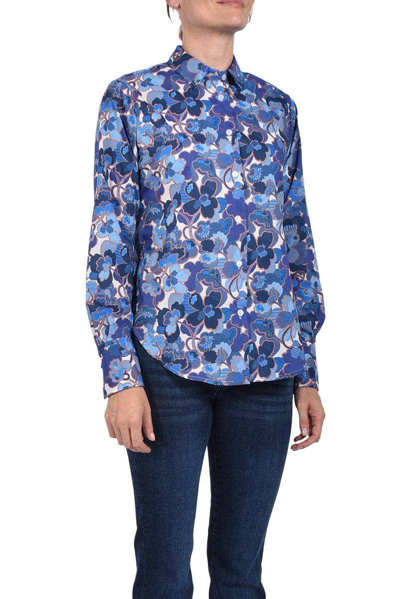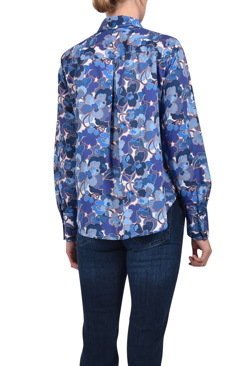 Verspielt und stilvoll: Die Bluse aus reiner Baumwolle zeigt ein großes Liberty-Blumenmuster, akzentuiert mit langen Manschetten und einer Kellerfalte im Rücken ? feminin mit besonderem Detail.