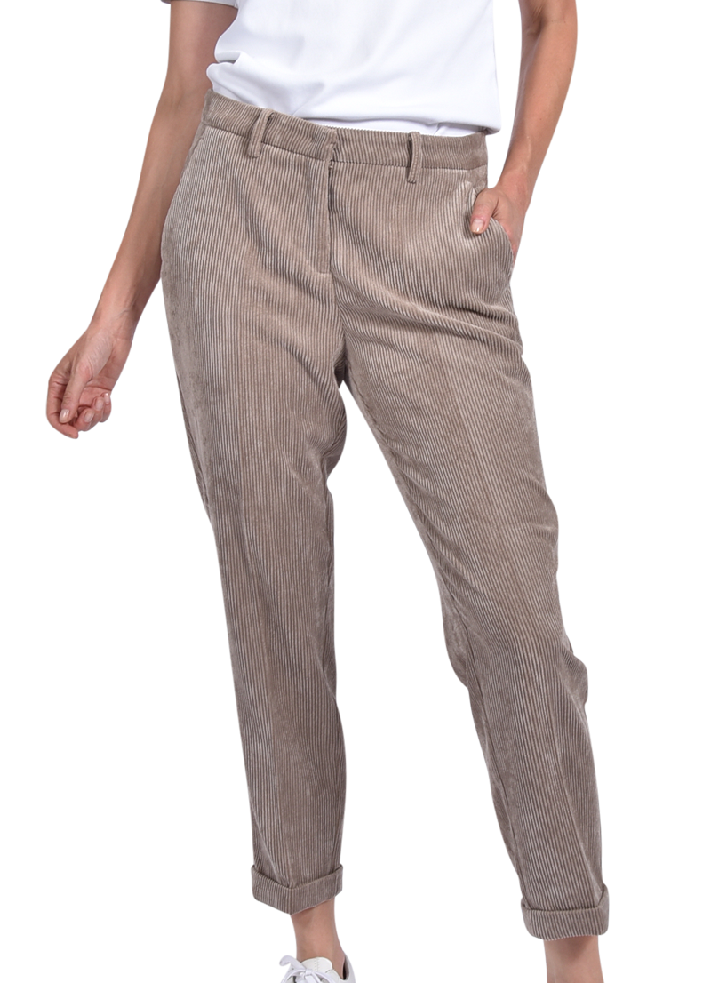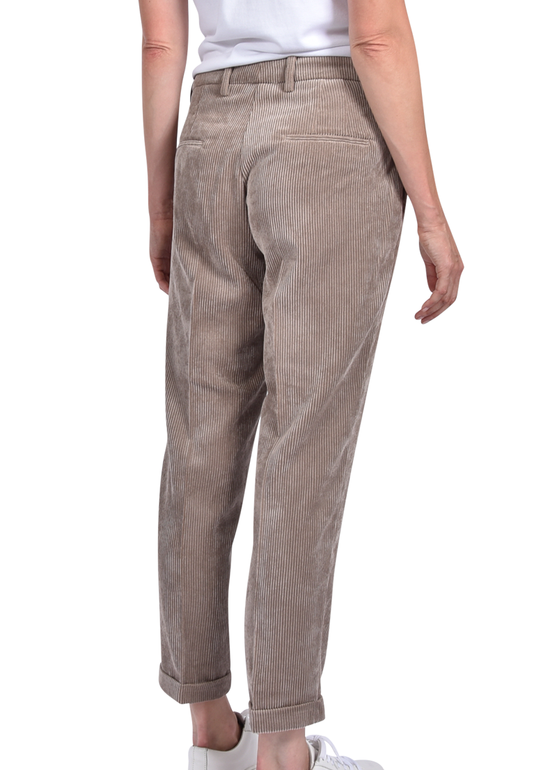 Anspruchsvolles Design kombiniert mit angenehmen Tragekomfort. Besonders die breiten Umschläge an den Abschlüssen und die Bügelfalten der Hose Krystal von Cambio ergeben ein harmonisches Zusammenspiel.