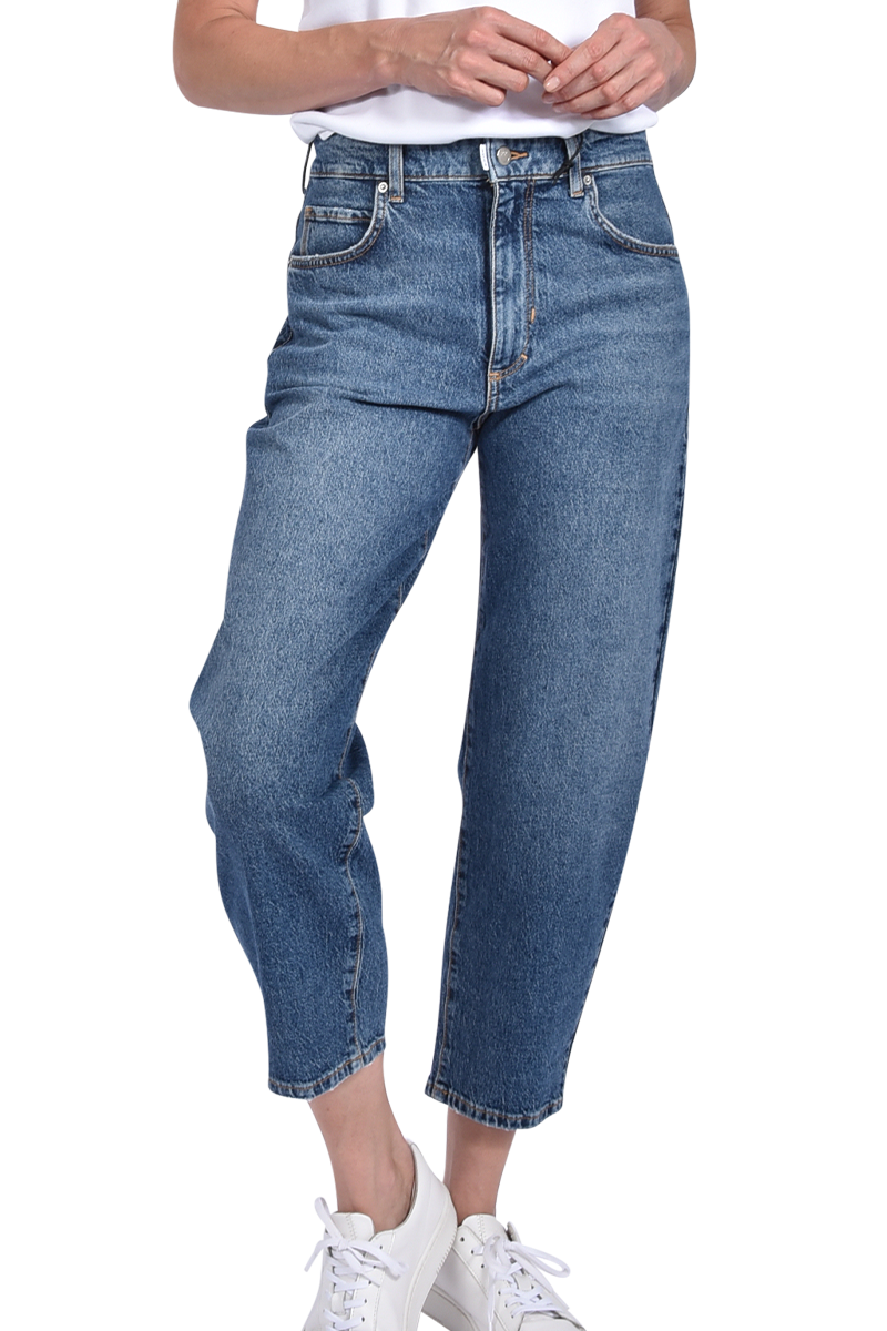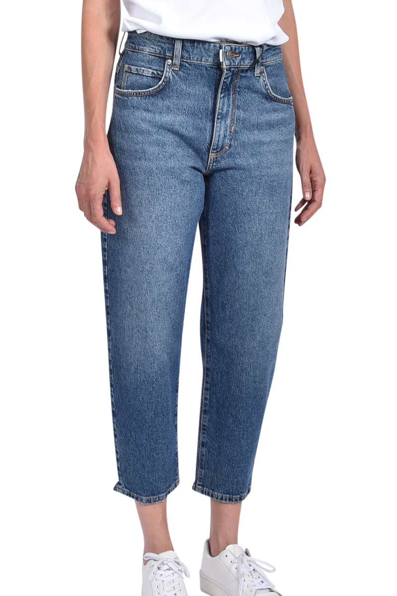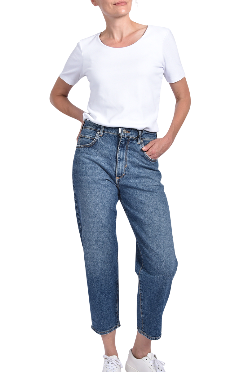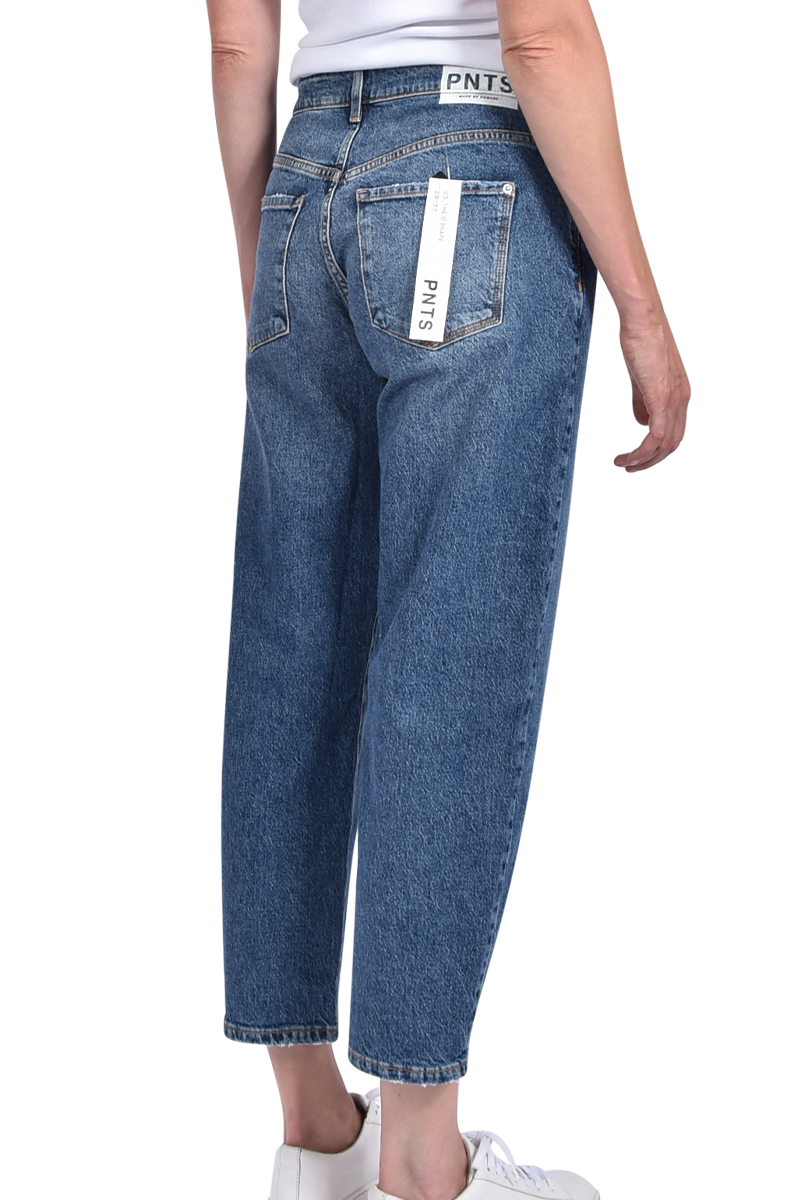 Die Denim 05_THE O SHAPE kommt in klassischer, blauer Waschung mit helleren Effekten. Sie hat eine O-Schnittform mit höherer Leibhöhe und leicht verkürzter Beinlänge.