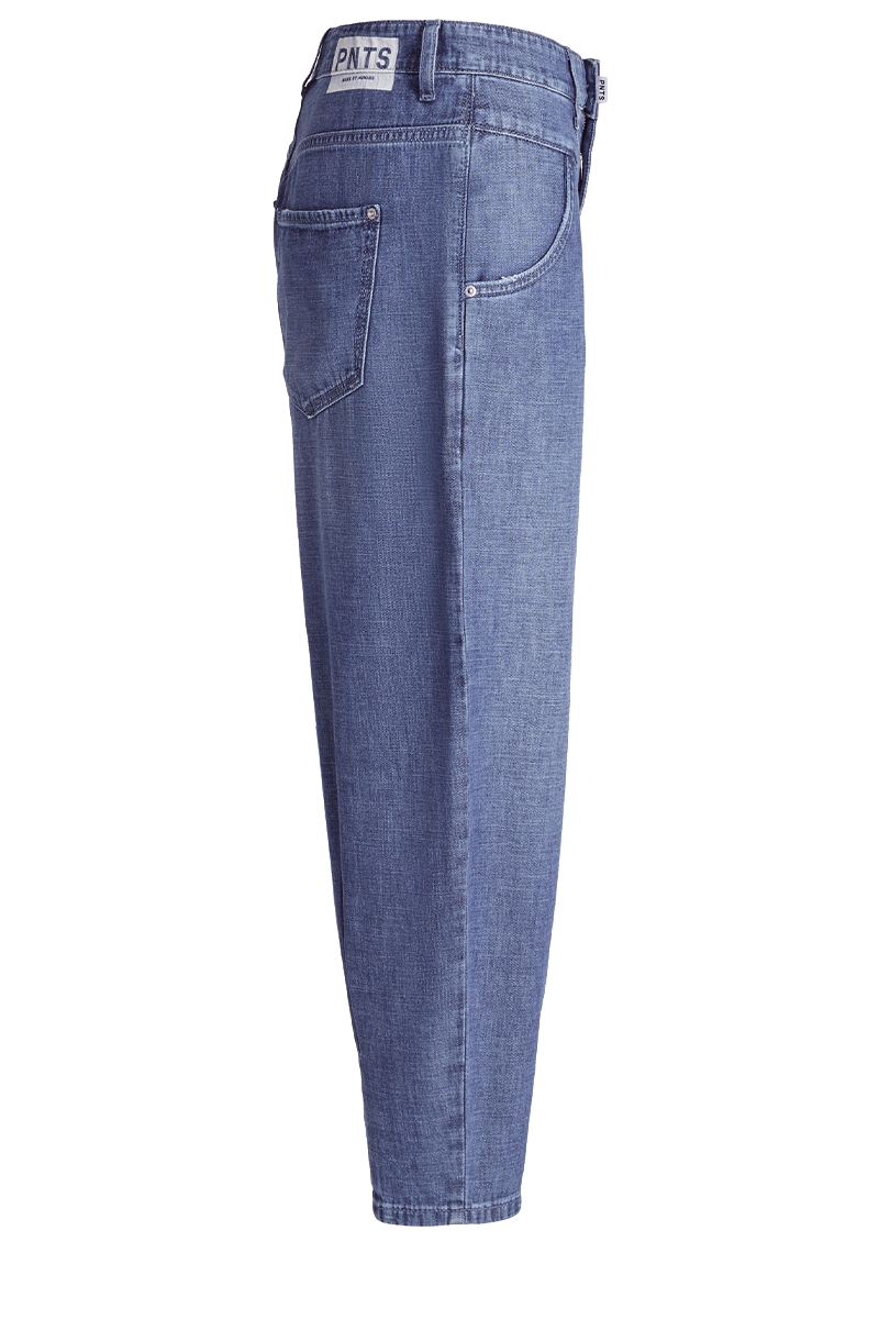 Die Hose hat eine O-Schnittform mit eingearbeiteten Bundfalten vorne, Kellerfalte am Saum hinten und höherer Leibhöhe. Die Beinlänge ist leicht verkürzter.