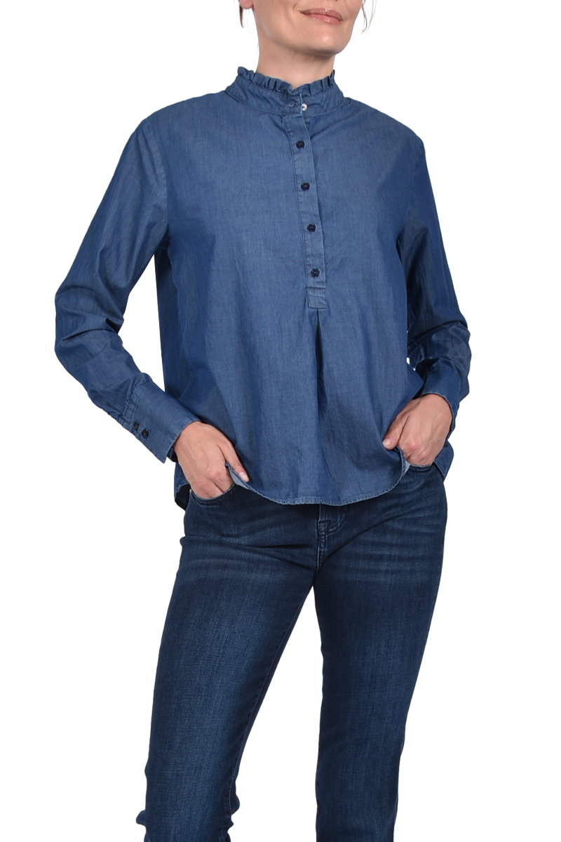 Lässige Bluse aus Denim in moderner Polosilhouette. Der fein gearbeitete Rüschensaum verleiht dem Klassiker eine feminine Note mit modischem Twist.