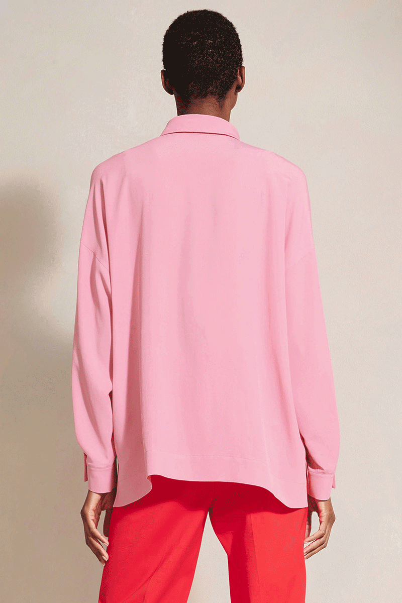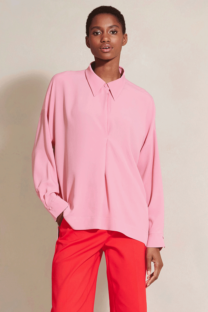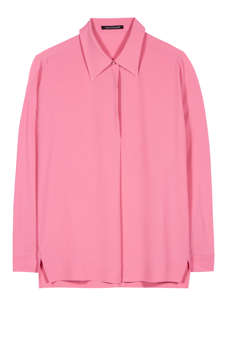 Moderne Hemdbluse in schwerer Seidenqualität mit Acetat-Anteil und halber, verdeckter Knopfleiste. Die stark überschnittenen Schultern und der seitlich geschlitzte Saum mit leicht verlängertem Rückenteil, unterstützen die lässige Passform.