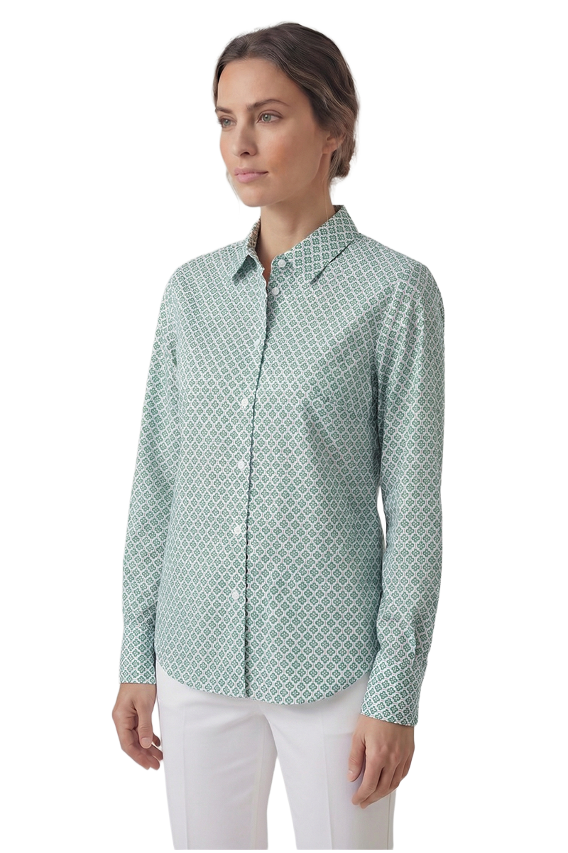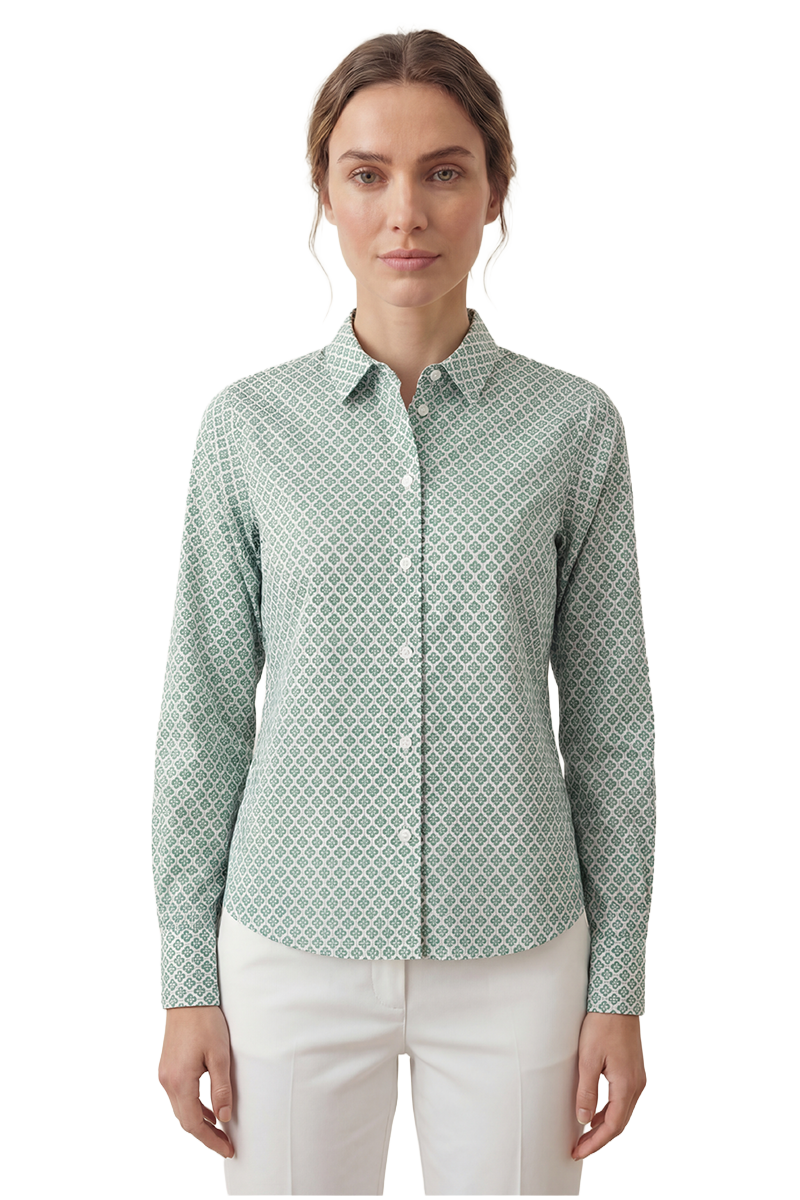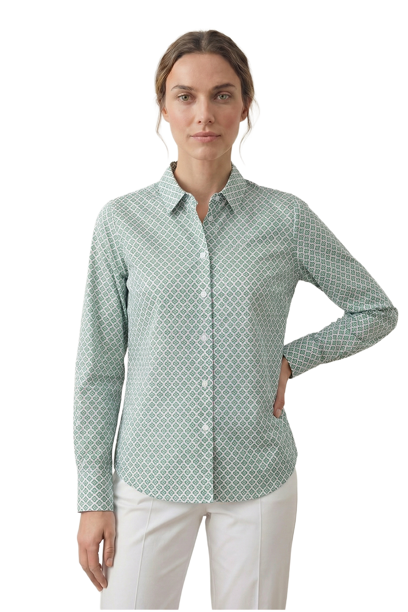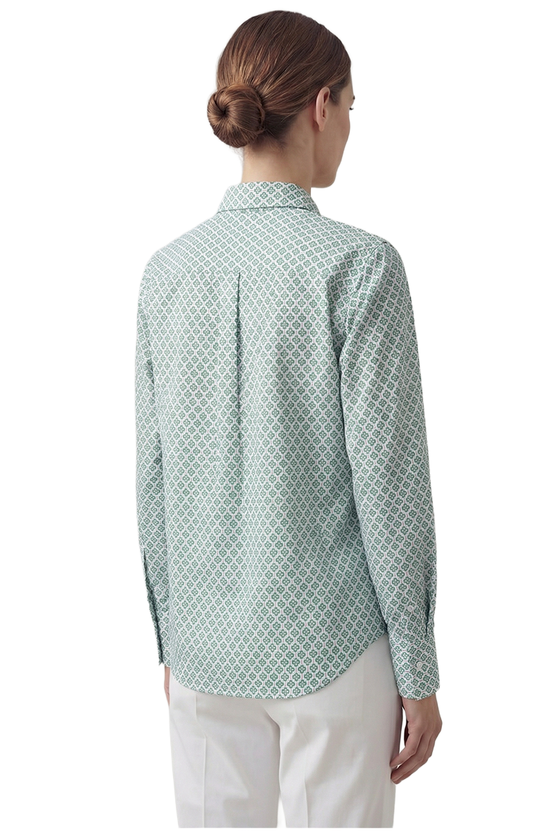 Bluse mit feinen Liberty-Streifen und kleinen Bl?ttern, kombiniert mit eleganter R?ckenfalte ? zart und besonders.