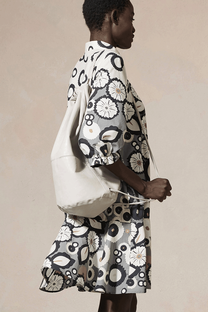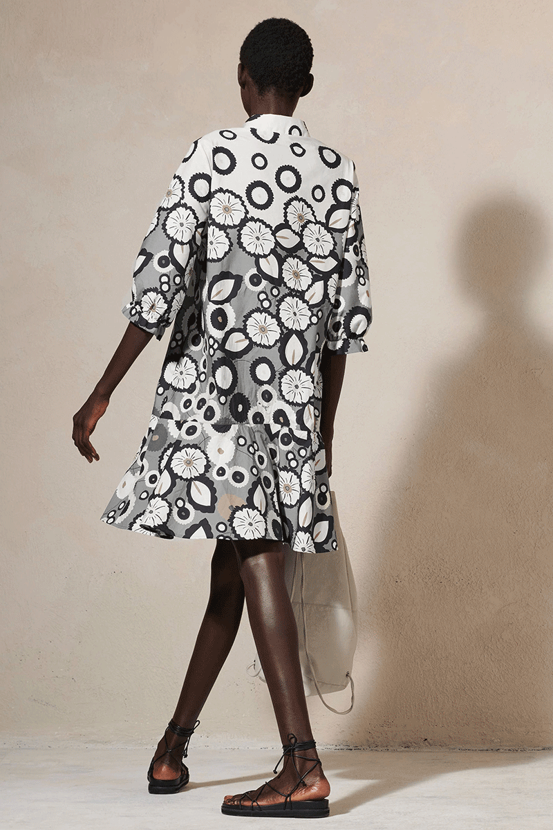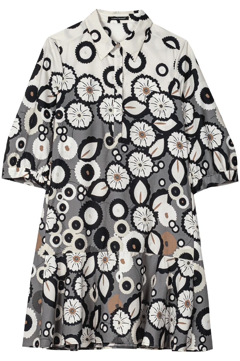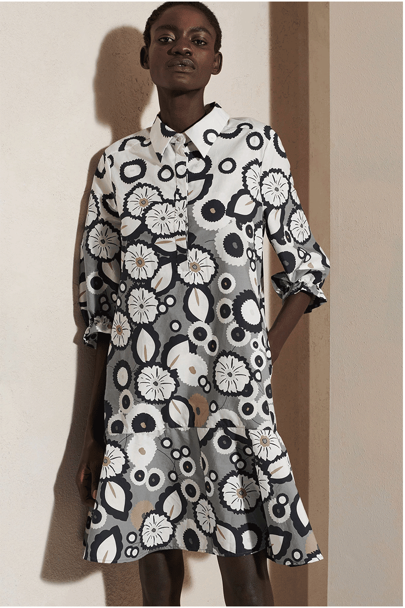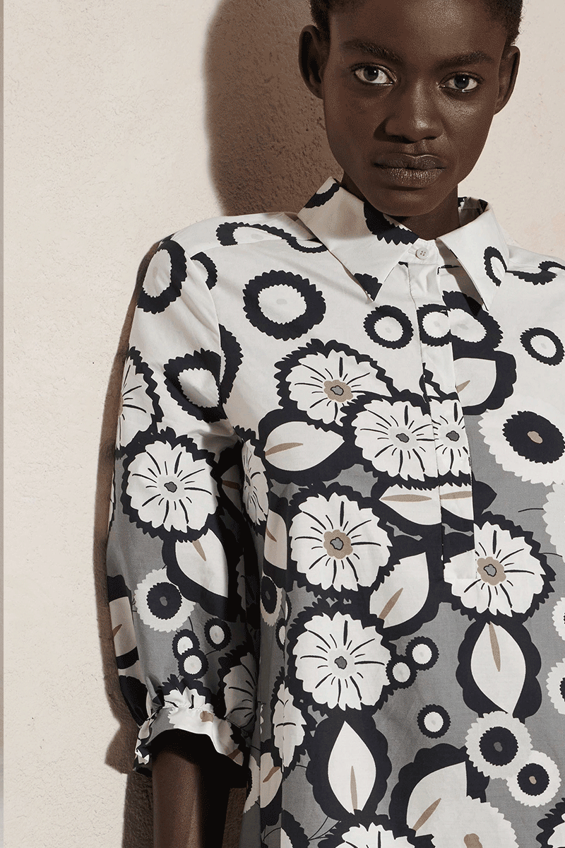 Locker geschnittenes Hemdkleid mit ausgestelltem Saum. Das Kleid ist mit einem exklusiven, abstrahierten Blumen-Dessin bedruckt und mit einer verdeckten Knopfleiste ausgestattet. Das leichte Baumwoll-Material gibt ein angenehmes Tragegefühl.