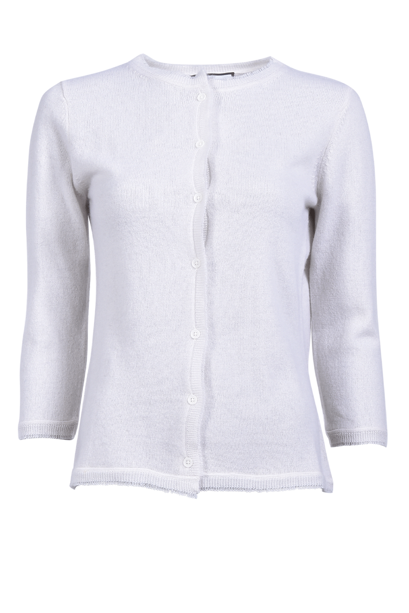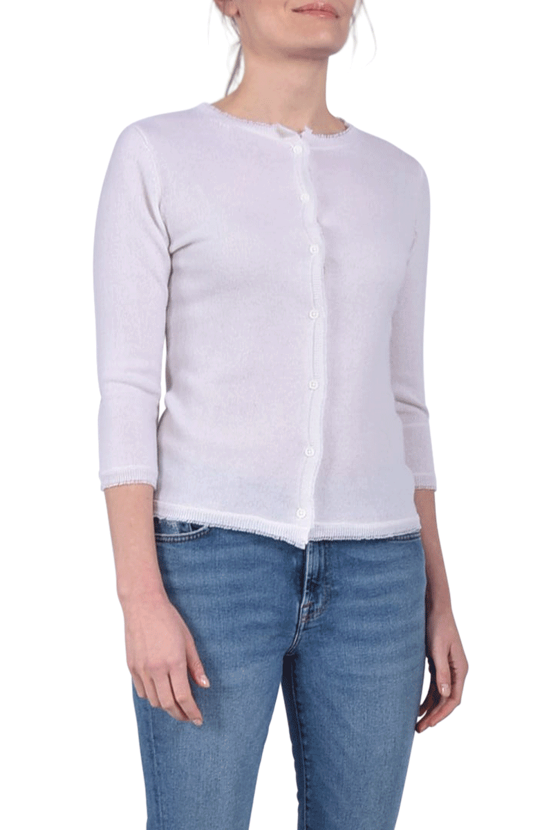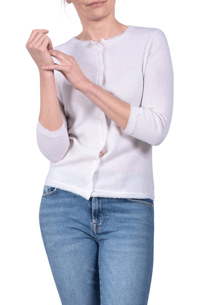 Diese kurze Jacke, mit einem Rundhalsausschnitt, ist aus 100% weichem Cashmere gefertigt. Der besondere Fransensaum gibt der Jacke ein individuelles Detail.
