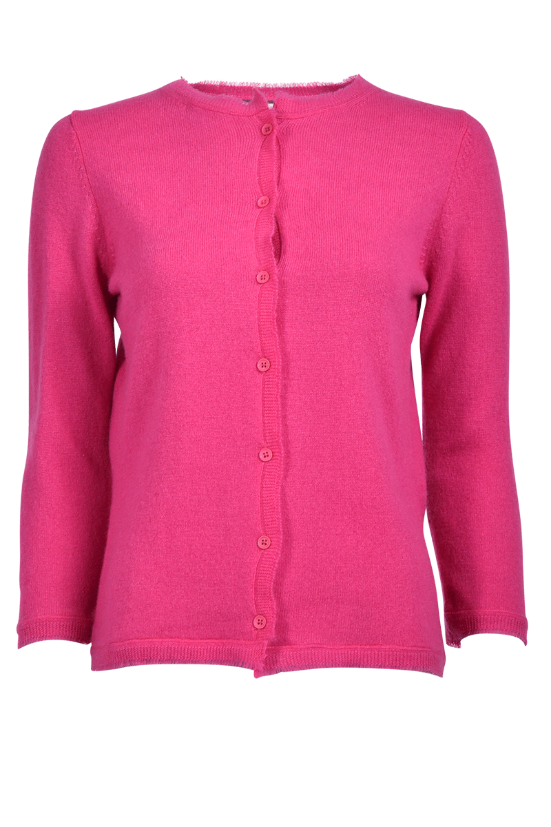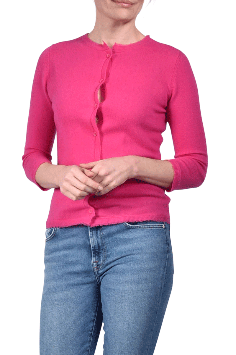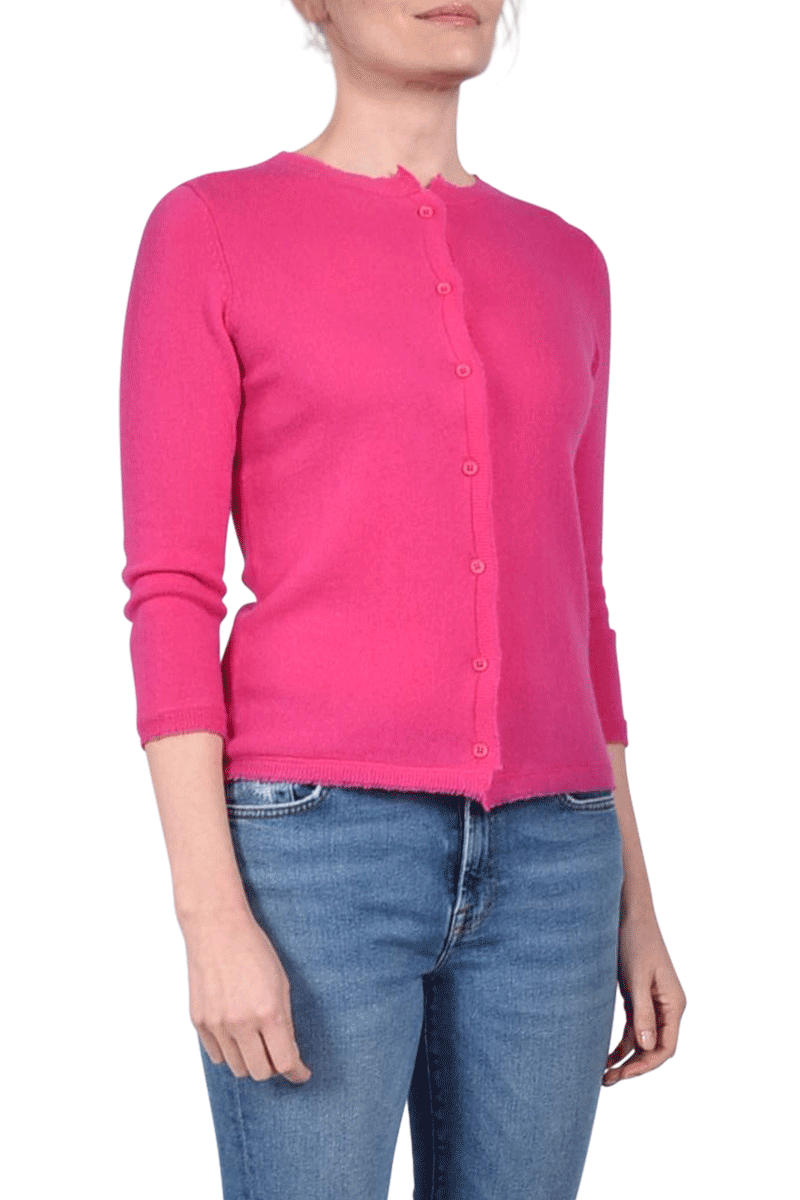 Diese kurze Jacke, mit einem Rundhalsausschnitt, ist aus 100% weichem Cashmere gefertigt. Der besondere Fransensaum gibt der Jacke ein individuelles Detail.