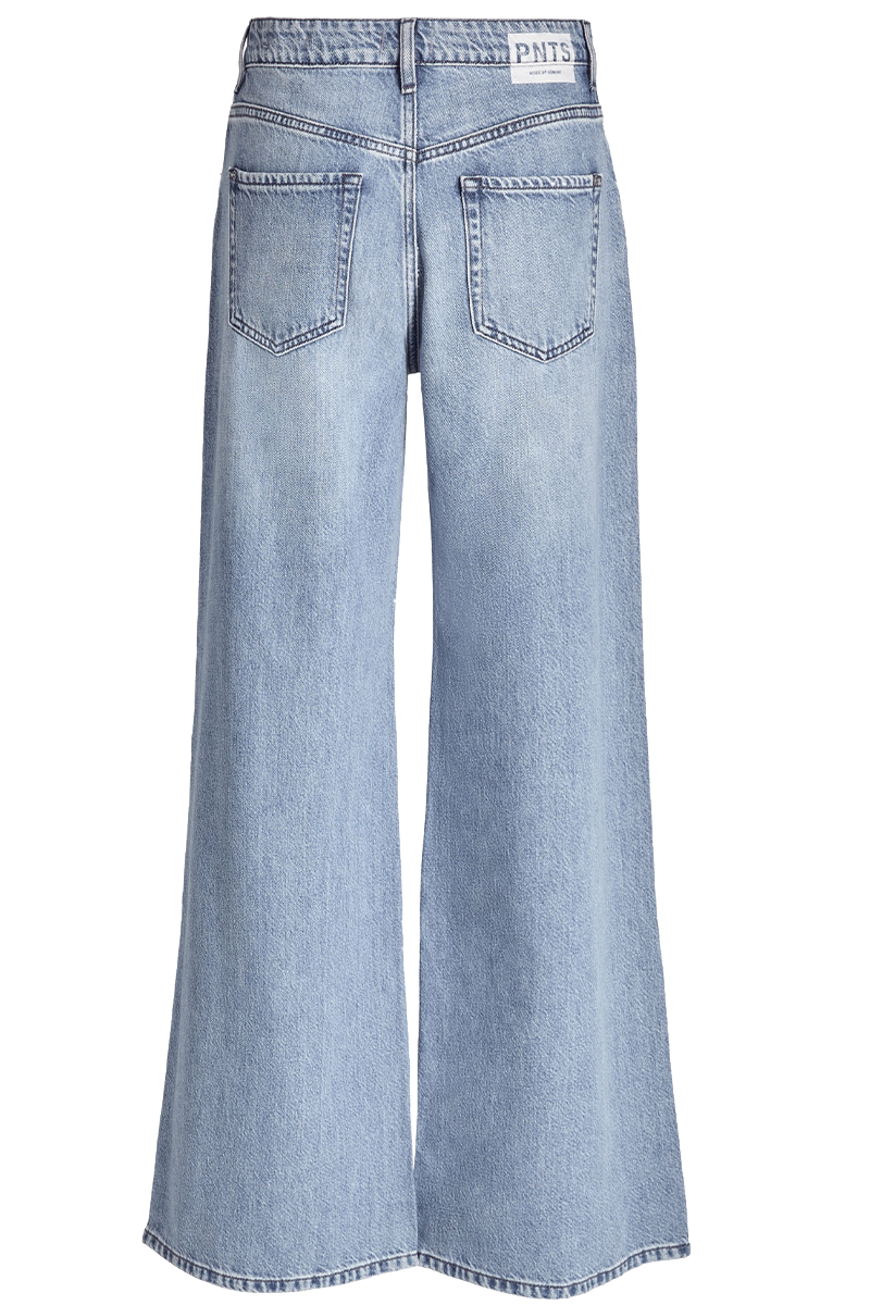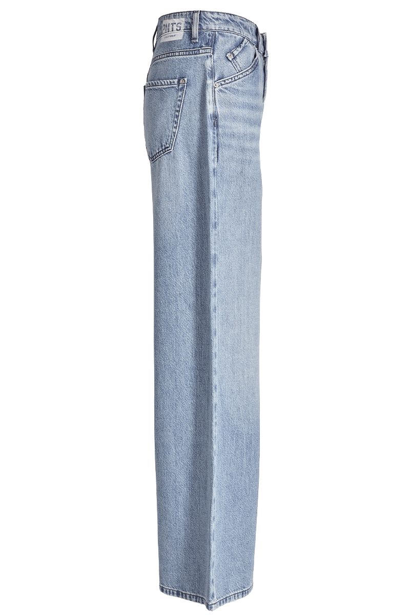 Die Denim 16_THE RAVER in mittlerer Waschung mit helleren Abriebstellen. Sie hat eine extremere Baggy Schnittform mit sehr weitem ?berlangem Bein.