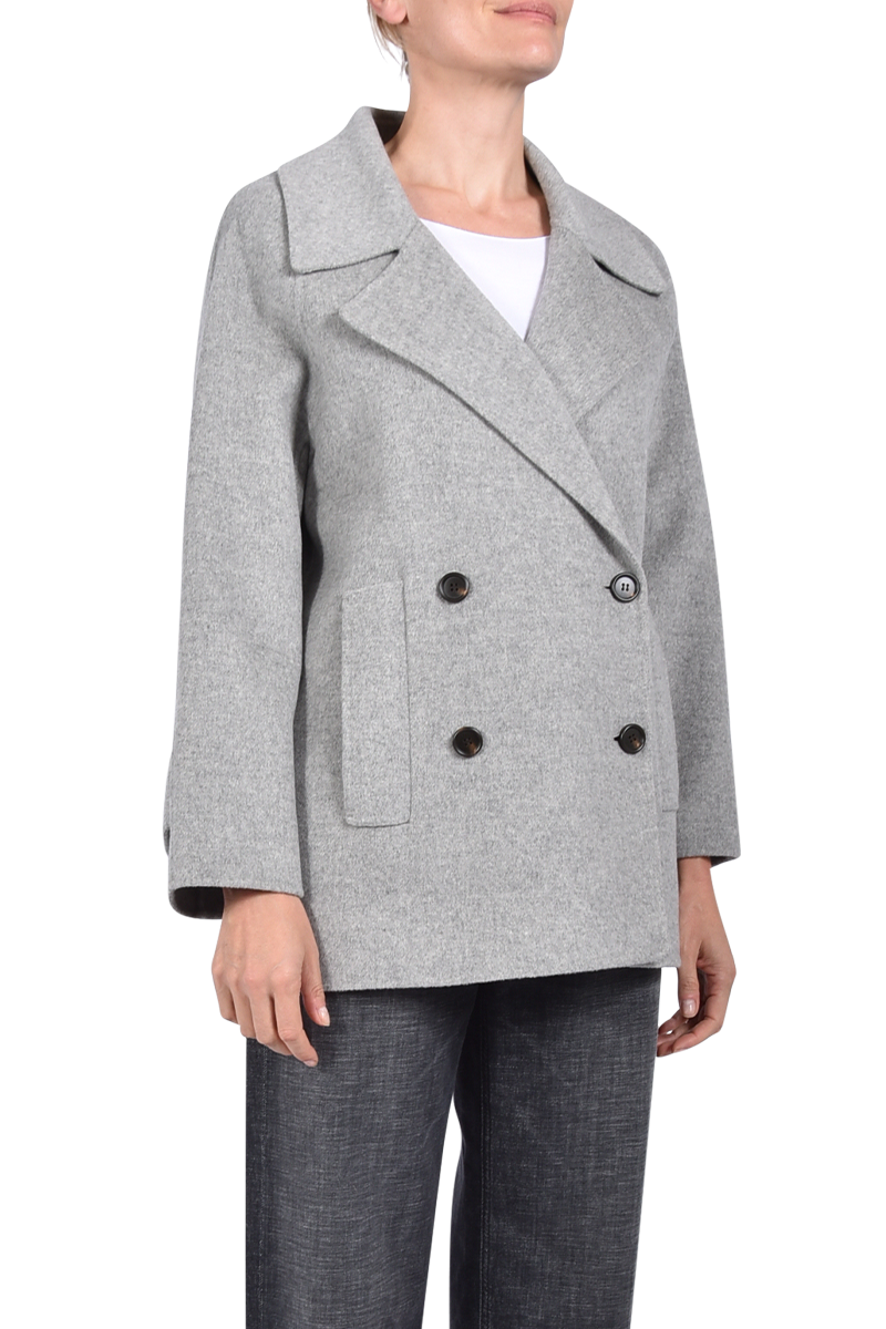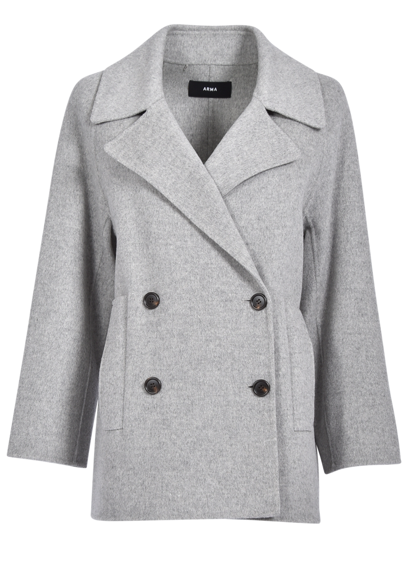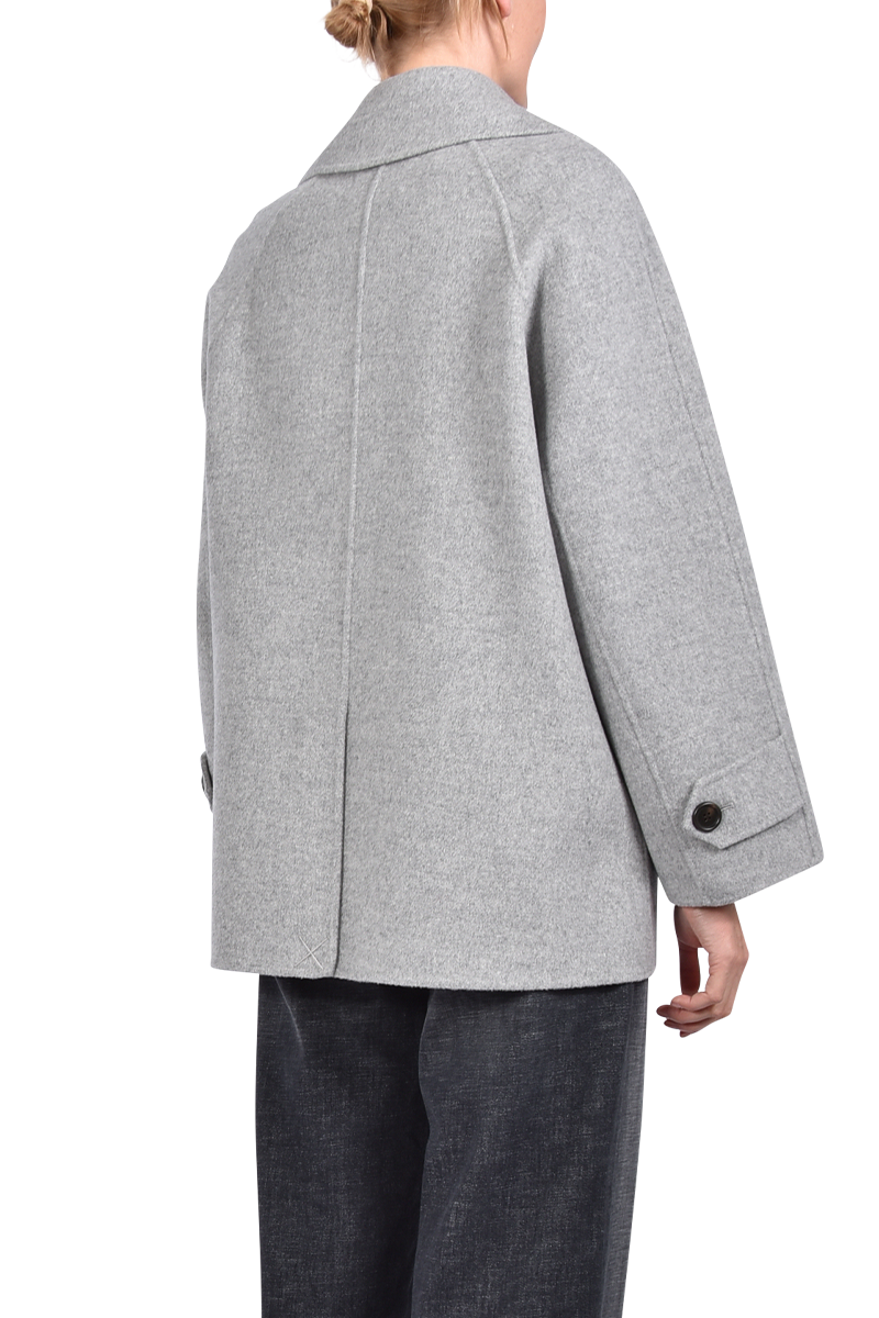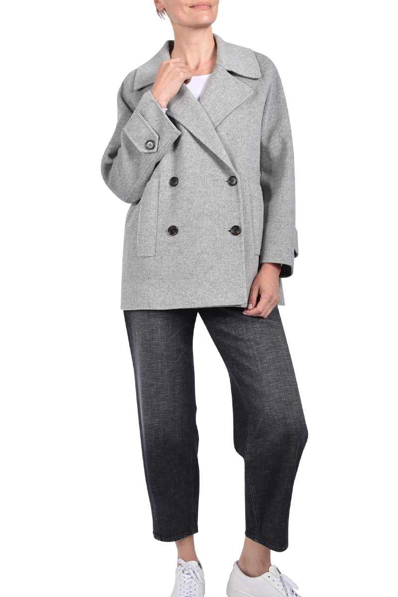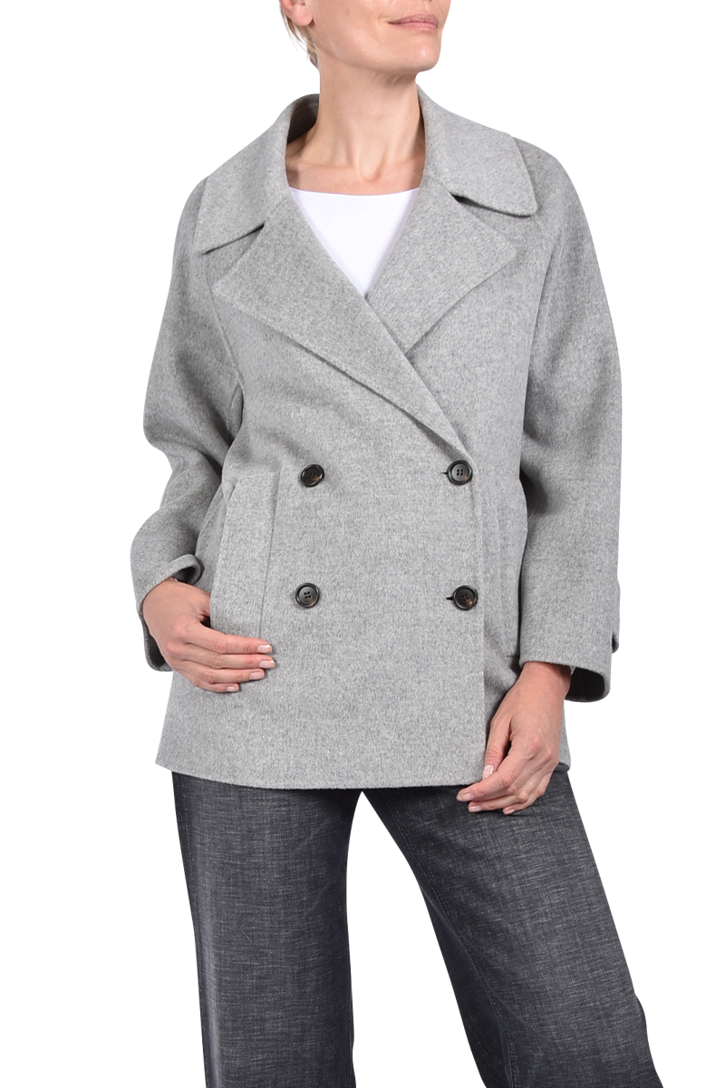 Die Kabanjacke wurde aus reiner Wolle gefertigt und besticht durch eine weiche Haptik. Der abfallende Reverskragen, der verkürzte zweireihige Schnitt und die Leistentaschen zeichnen dieses hochwertige Modell aus.