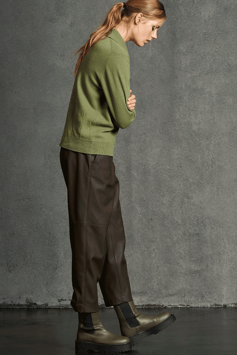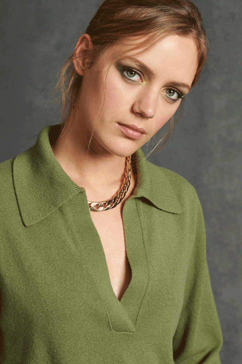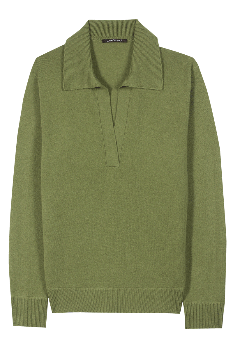 Langärmliges Poloshirt aus fein gestricktem Kaschmir-Mix mit tiefem V-Ausschnitt und Minderungsdetails an den Schultern. Der Kragen und die Ärmelabschlüsse bestehen aus Rippbündchen.