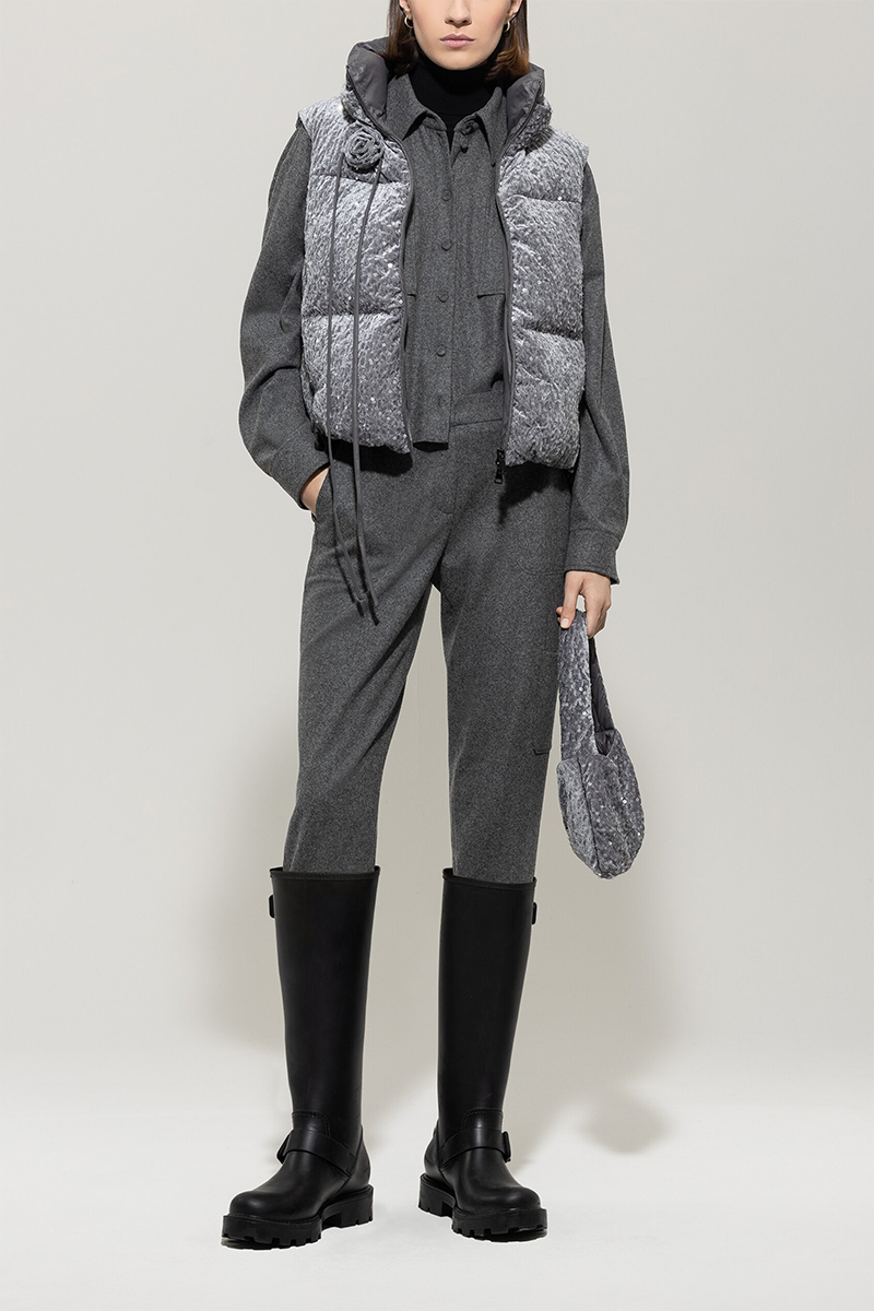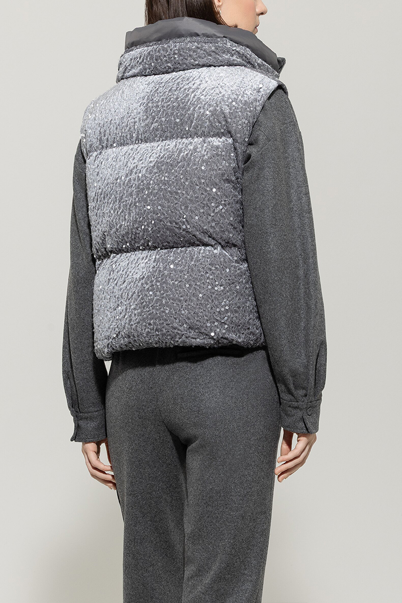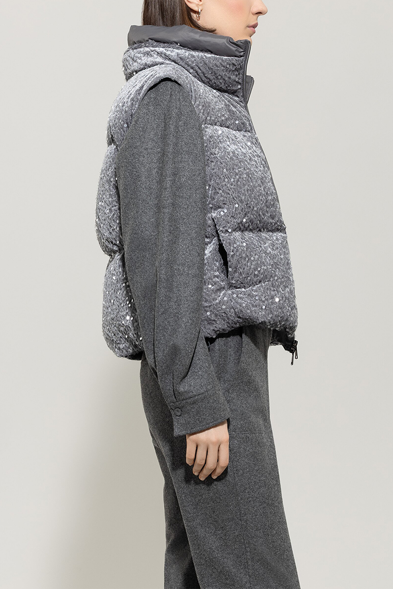 Warme Daunenweste mit Stehkragen, Zwei-Wege-Reißverschluss, Seitentaschen und verstellbarem Tunnelzug am Saum. Eine Extra-Portion Glamour versprüht das Obermaterial aus Samt mit transparenten Pailletten.